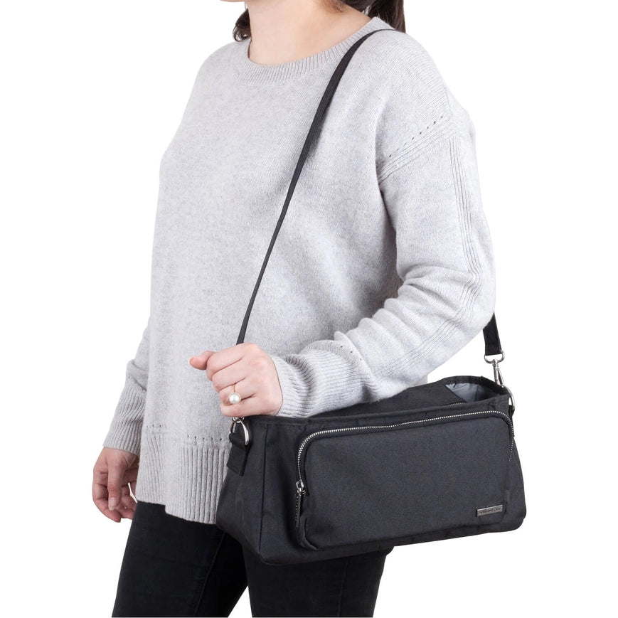 Offering parents stylish and practical on-the-go convenience, the Outlookbaby Pram Caddy is designed to impress. Made from the highest quality luxe canvas material, the Outlookbaby Pram caddy includes two matching detachable pram or stroller straps/clips, and a convenient detachable shoulder/pram strap, easily converting your Pram Caddy into a shoulder bag when out and about. The Outlookbaby Pram Caddy will keep yours and your baby’s belongings super organised and is a must-have item for any modern parent. Features Guaranteed to fit * Dimensions: 36L 17H 13 gusset cm * Fits 3 & 4 wheeled rear & forward-facing prams and strollers with ease * Easy Fit adjustable Velcro straps are guaranteed to fit any pram or stroller handle bar * For use on single, or double/tandem strollers or prams  The Design * Handy Detachable Shoulder/Pram Strap Included * Large zippered central pocket * 3 interior pockets to separate essential items
