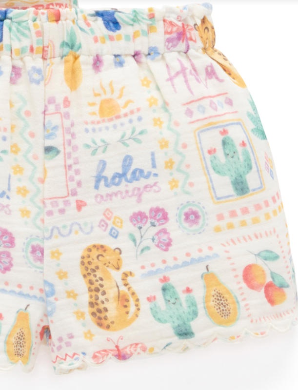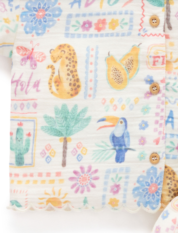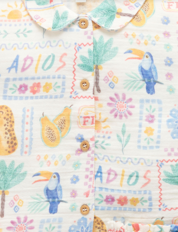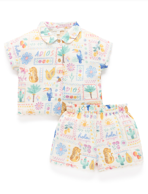 She can play all summer long in our lightweight Postcards Set. Featuring a pretty floral top with a ruffle hem detail and matching shorts with an elasticated waistband. Made from our 100% Organic Cotton muslin for a soft and breathable outfit, perfect for those warm sunny days. 2 piece set Sweet all over summer adventures print Shirt with collar and wood look buttons down the front Shorts with elasticated waistband for comfort Scalloped hems Made from 100% Organic Cotton Muslin This item is available in both baby & kids sizing. Perfect for matching with siblings, cousins and friends, or purchase multiple sizes for wear in future years.