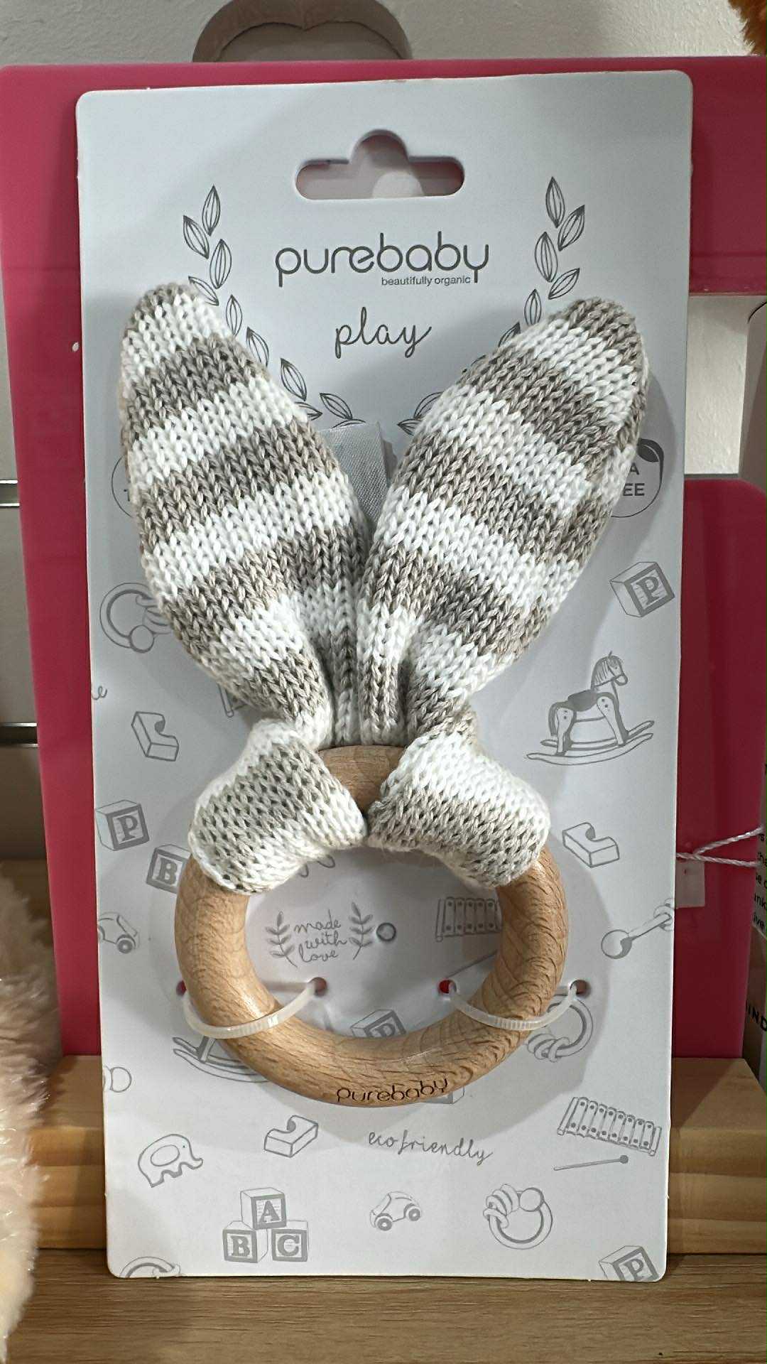 Our Rabbit Ear Teether is perfect for those little hands to grab a hold of and soothe their irritated gums. Featuring cotton knitted and knotted bunny ears, attached to a 100% beech wood ring. Naturally antibacterial and chemical free beechwood Great for developing hand/eye coordination 100% Cotton Knit with Polyester filling Ring Made from 100% Beech Wood Recommended age range: 10 months +